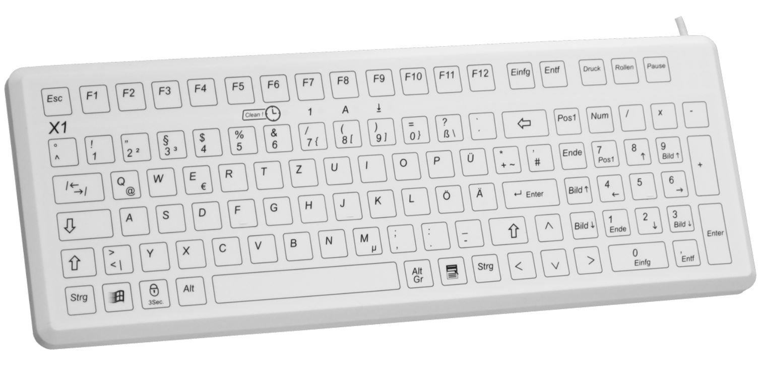 Klawiatura z 105 klawiszami, w tym 12 klawiszami funkcyjnymi i klawiaturą numeryczną, posiada pełną ochronę przed pyłem i cieczami (IP68), co pozwala na jej zanurzenie. Bezszwowy front spełnia najwyższe wymagania higieniczne, a funkcje CleanRemind i CleanLock zapewniają łatwe czyszczenie i zapobiegają przypadkowemu uruchomieniu. Klawiatura jest odporna na środki dezynfekujące, a jej konstrukcja umożliwia szybką sterylizację. Cechuje się cichym pisaniem, precyzyjnymi klawiszami o niskiej sile nacisku oraz opcją mocowania magnetycznego. Kompatybilna z systemem MS Windows i interfejsem USB. Przeprowadzono testy EMC zgodnie z normą EN 60601-1-2, co zapewnia jej bezpieczeństwo w środowisku medycznym.