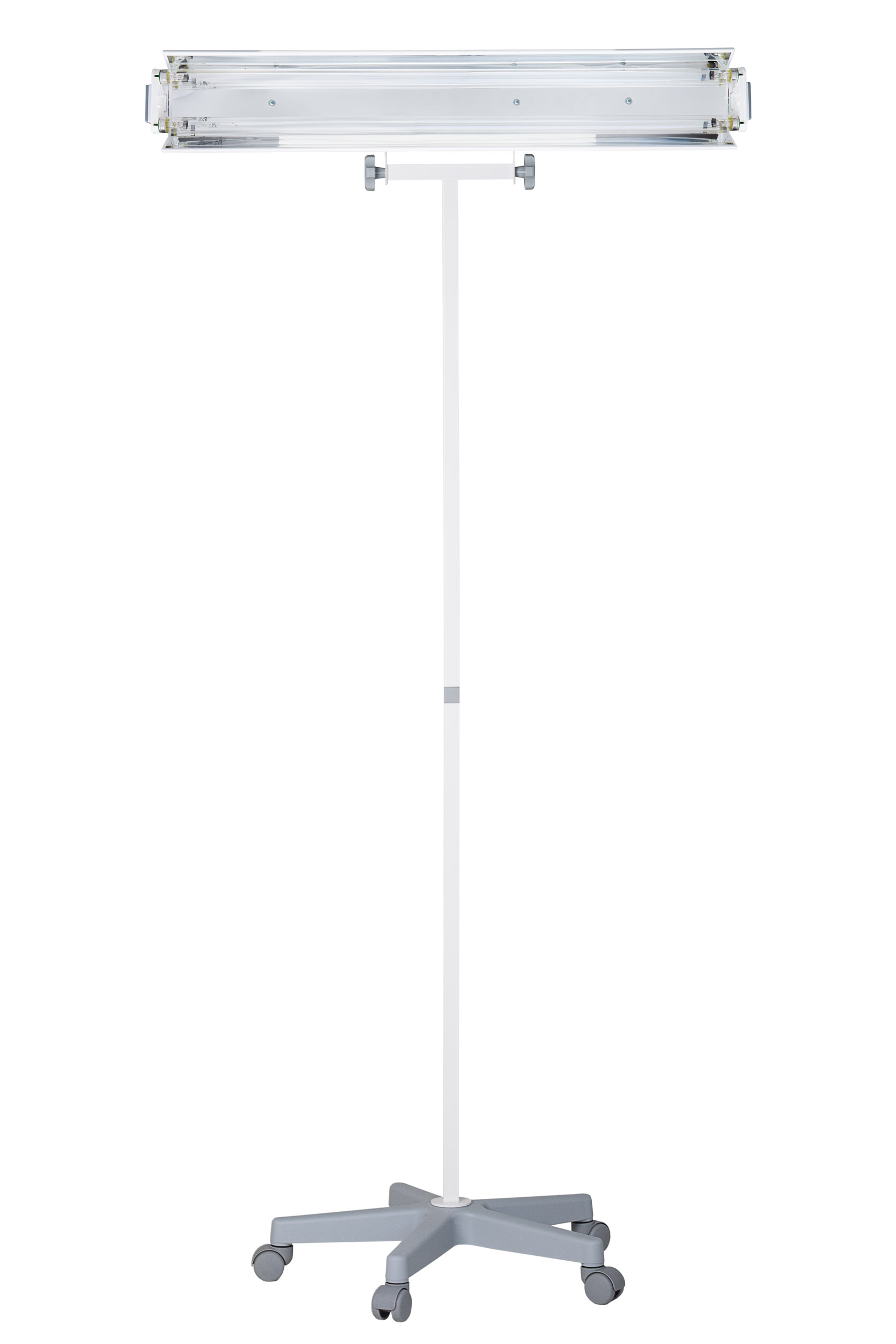 Montaż na statywie przejezdnym oraz przewód z wtyczką do gniazdka ułatwia dezynfekcję w różnych pomieszczeniach.