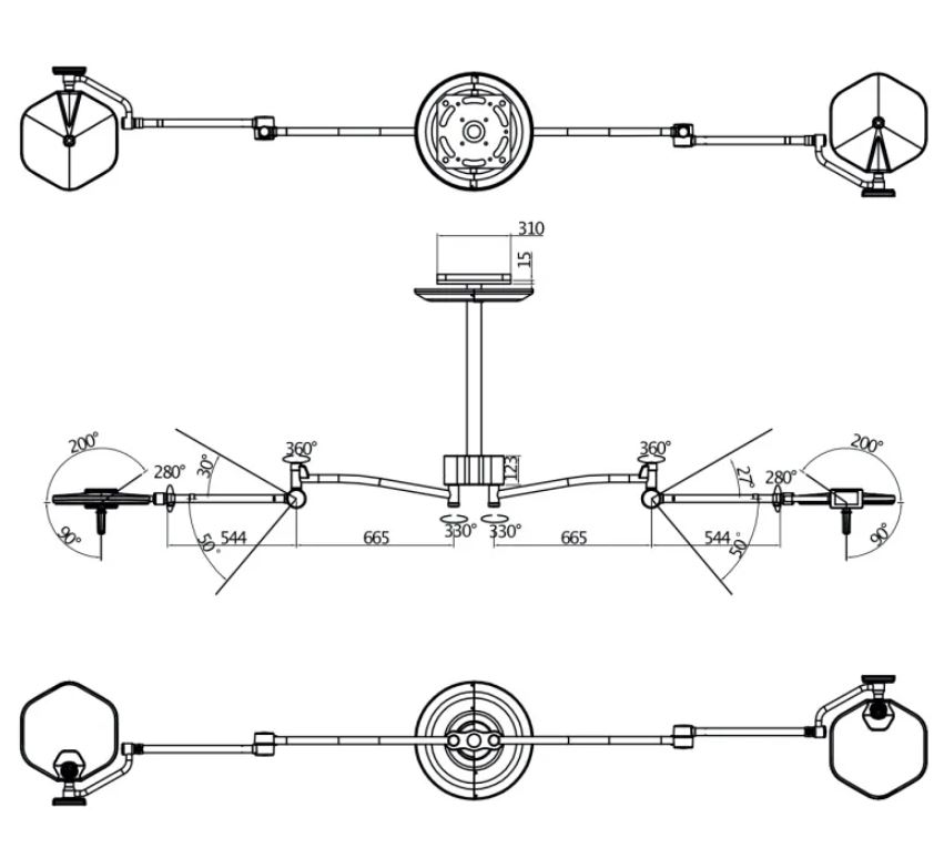 Lampa zabiegowo-operacyjna dwuczaszowa S300DC sufitowa z regulacją natężenia światła, regulacją temperatury barwowej oraz regulacją pola roboczego. Zastosowano technologię minimalizacji cienia.