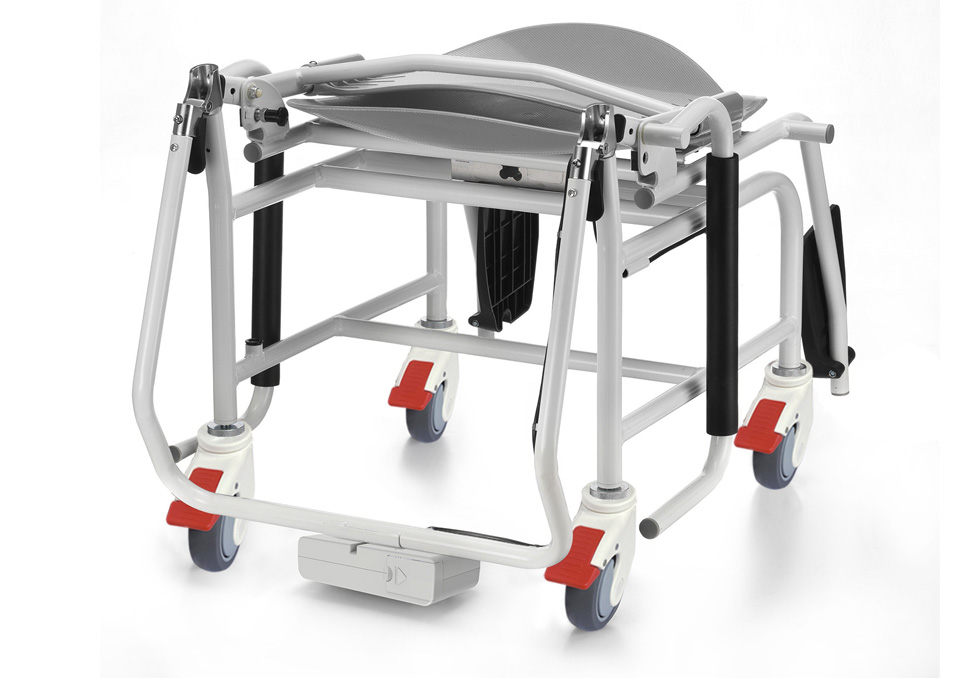 ergonomicznie wyprofilowane siedzisko z antypoślizgową fakturą zabezpiecza przed zsunięciem się pacjenta z wózka,